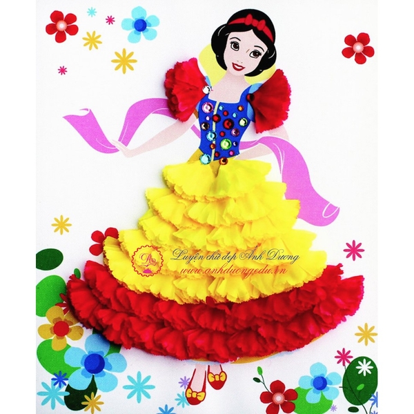 🍄 Bé sẽ dùng những bông hoa vải có sẵn, gấp mép vào và dùng hồ dán để dán vào tranh theo đúng vị trí Hết các tầng lại xếp các tầng váy khác lên trên để tạo thành các lớp váy nhiều tầng