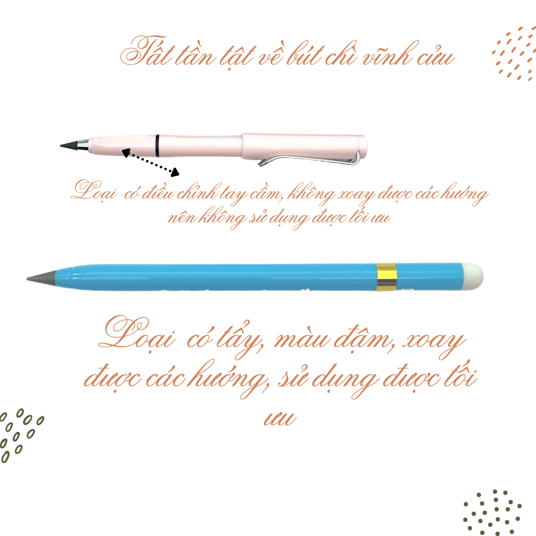 Trong quá trình tìm hiểu về rất nhiều loại bút chì Vĩnh Cửu mình đã thử 1 số loại như sau: loại thân gỗ cầm chắc tay, loại thân nhựa thiết kế hoa văn cũng đẹp, loại thân kim loại Sơn tĩnh điện có 1 đầu là đầu cảm ứng 1 loại nhìn giống cây bút máy, có rãnh định vị tay cầm và 1 loại bằng nhựa ABS nguyên sinh không độc hại với 1 đầu có tẩy kèm theo thì mình thấy như sau: