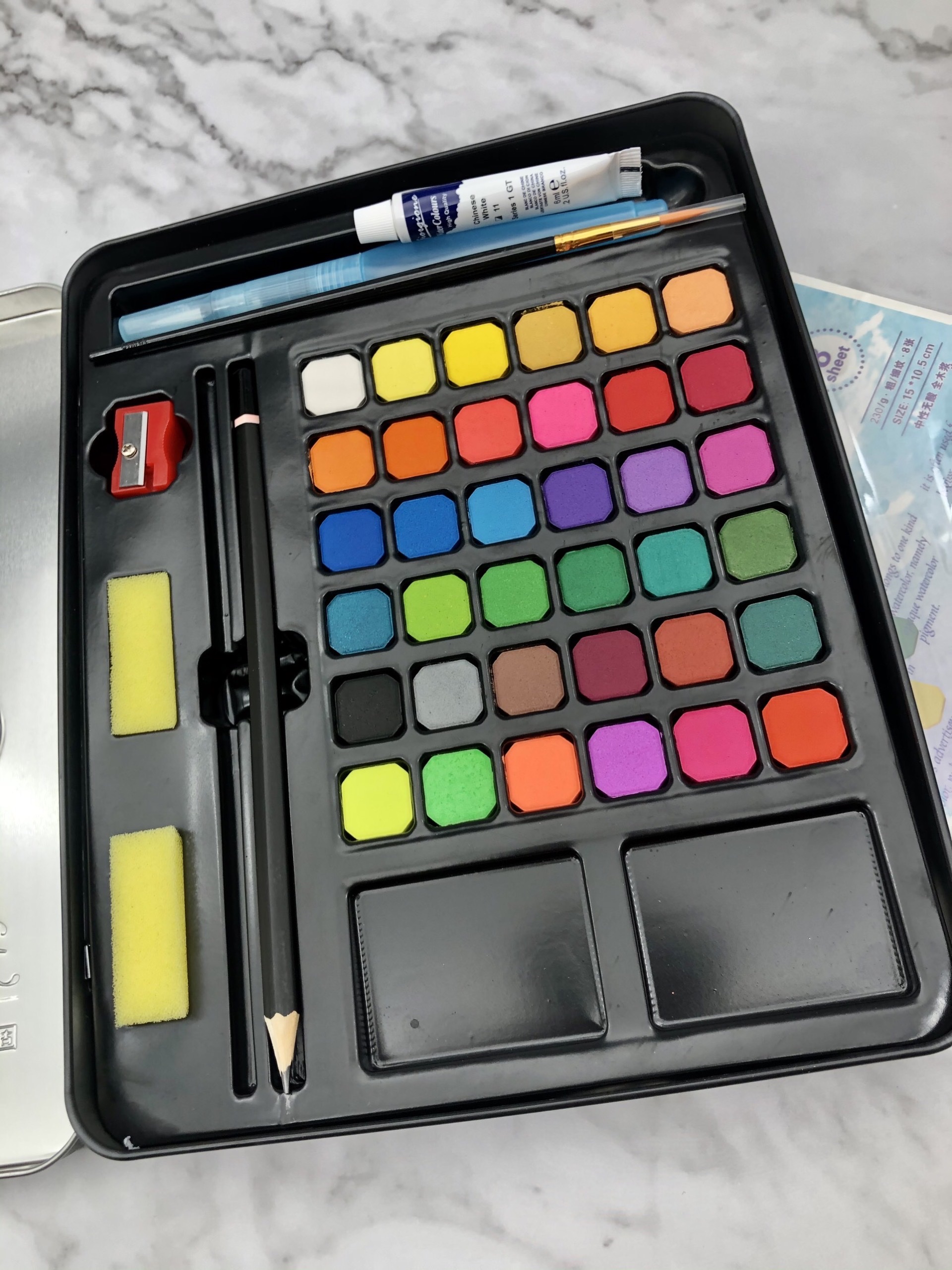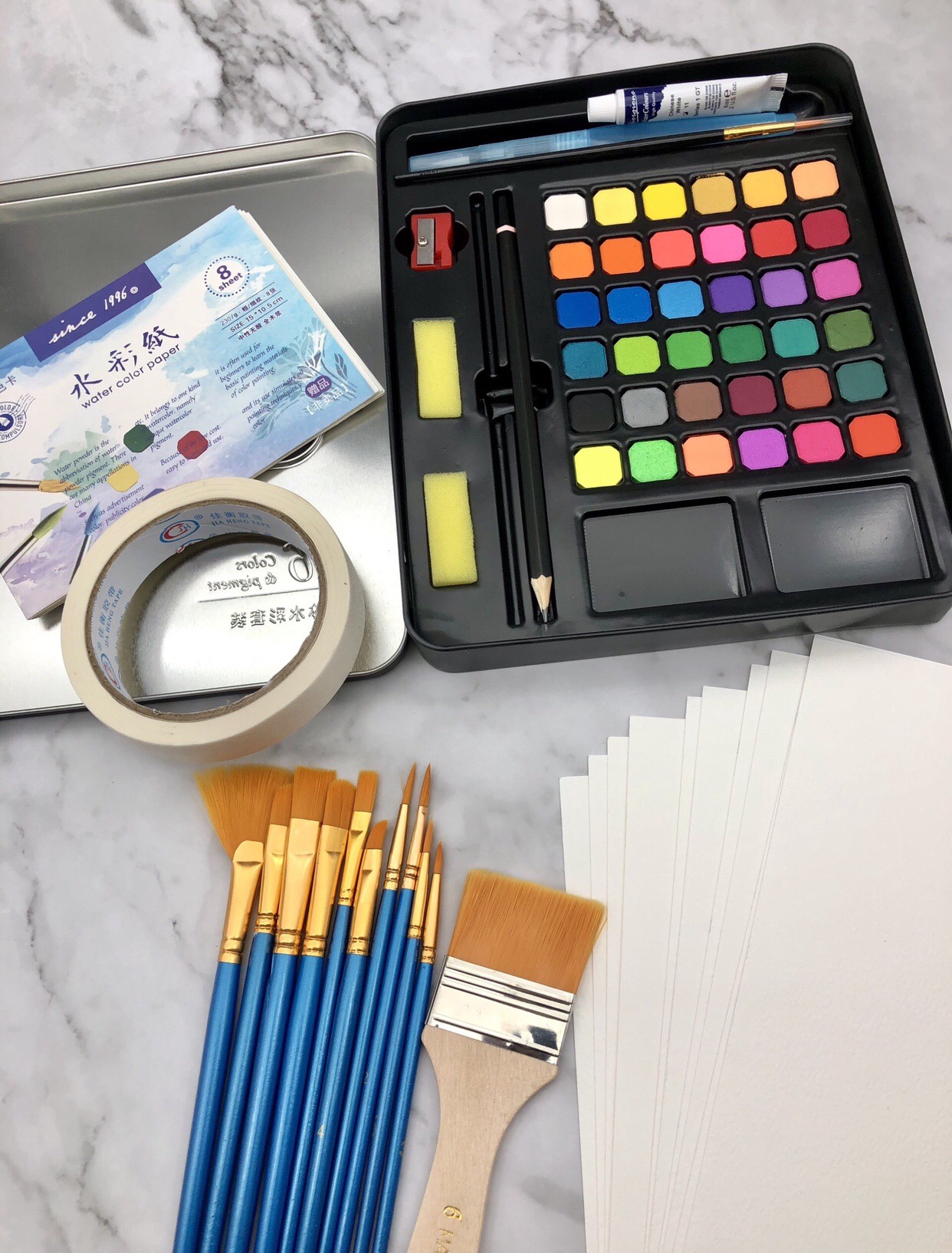 🎨 Không chỉ có bảng 36 màu mà còn được tặng kèm bút nước, bút lông, bút chì, miếng mút, giấy vẽ và tuýp trắng blend màu.